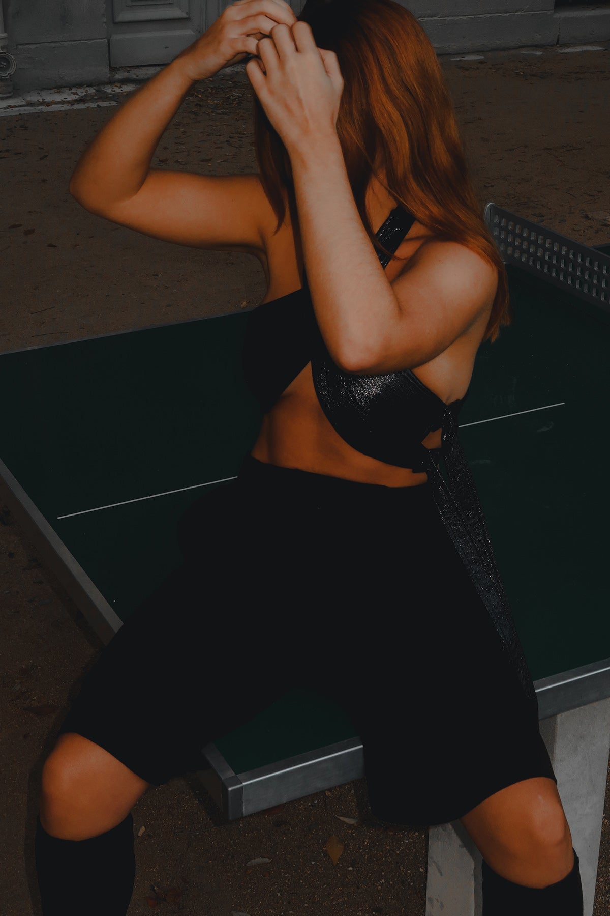 Top from the spring summer 2022 show by Courrèges is crafted from a cotton blend fabrication in a vinyl finish, featuring a V-neck, side buckle strap fastening and crossed strap construction.